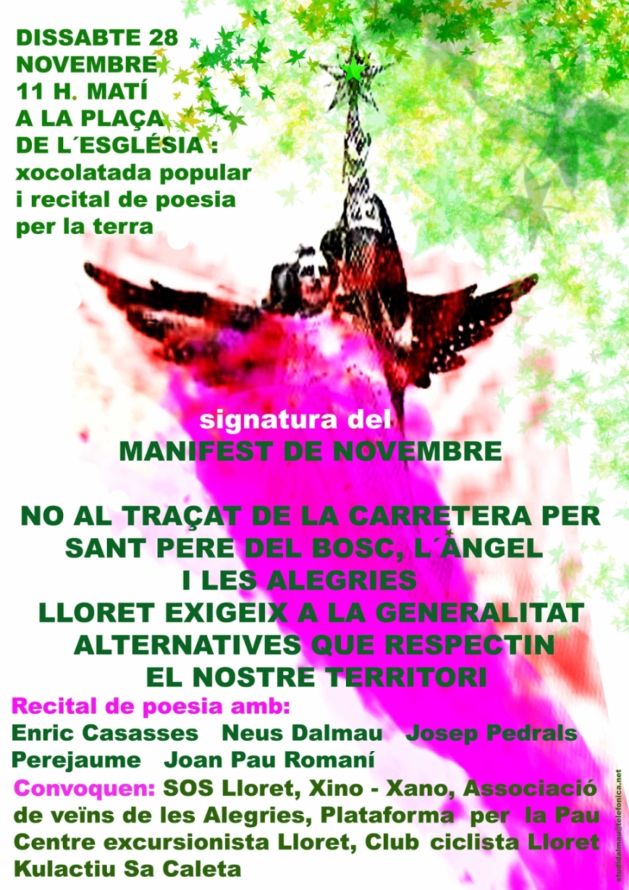 Avui, 28 de novembre, 13 associacions han signat en un acte públic a Lloret el Manifest de Novembre. En l’acte s’ha llegit un discurs al·legatori contra el traçat que estudia la Generalitat per unir Lloret amb l’autopista C-32 i, a continuació, s’ha procedit a llegir i signar el Manifest de Novembre. Les entitats adreçaran una còpia a l’Ajuntament de Lloret i una altra a la Generalitat.