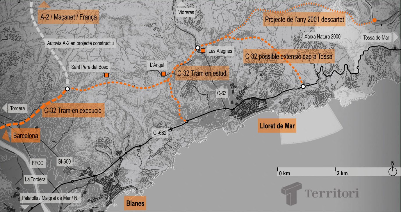 Un plantejament ràpid i propi d’enginyer de despatx a 70 km del territori a intervindre, faria la proposta actualment plantejada: el projecte que en pocs mesos començarà a construir-se ampliarà l’autopista C-32 que actualment arriba fins a la Gi-600 (Blanes-Tordera), fins a la carretera C-63 (Lloret-Vidreres), amb una connexió a Lloret-Papalús (a la terminal Pujo i Pujol), amb una longitud de 7 km i amb un cost de 100 M d’euros.