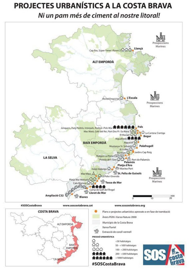 Només en l’últim mes, els principals promotors del moviment han inventariat projectes que podrien representar fins a 2.250 cases noves, quatre hotels, un camp de golf, un càmping projectat en espai protegit i la construcció d’edificacions en espais PEIN, a banda de 172 amarradors esportius nous i l’allargament de la C-32. “I només tenen a veure amb 9 dels 22 pobles de la Costa Brava”, feia notar Sergi Nuss, portaveu de la plataforma SOS Costa Brava, que subratllava que la recerca continua: “No sabem què més hi ha en el planejament urbanístic vigent dels tretze municipis restants i què poden significar altres plans i projectes urbanístics de gran impacte.”